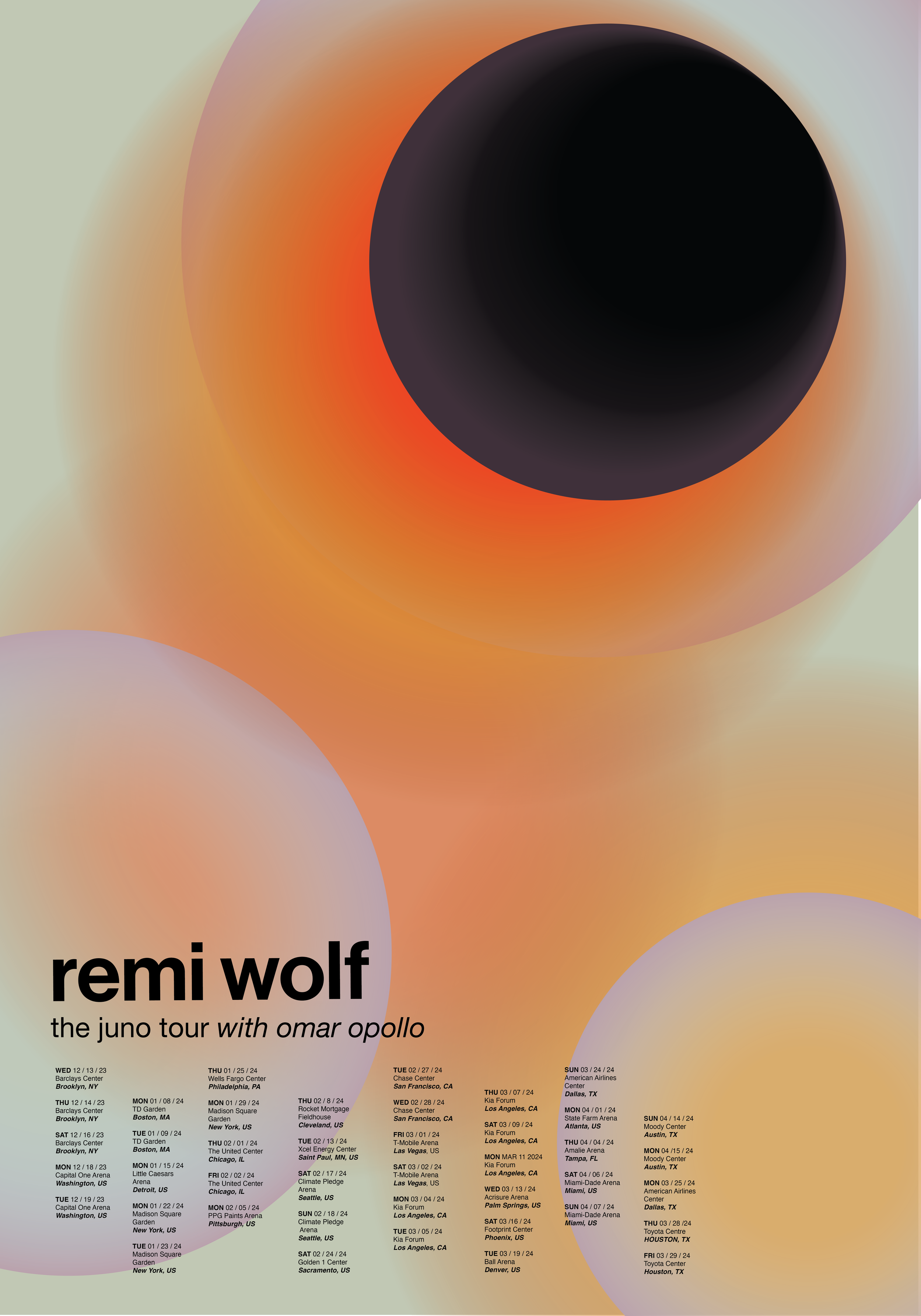 I reimagined Remi Wolf’s brand identity by creating a United States campaign for her Juno Tour. This album covers heavy topics revolving around the growth that comes from struggle through quirky lyrics and upbeat melodies. I used the symbolism of a black hole, and more importantly the light that surrounds it, to show the conflicting themes of sadness and celebration.
